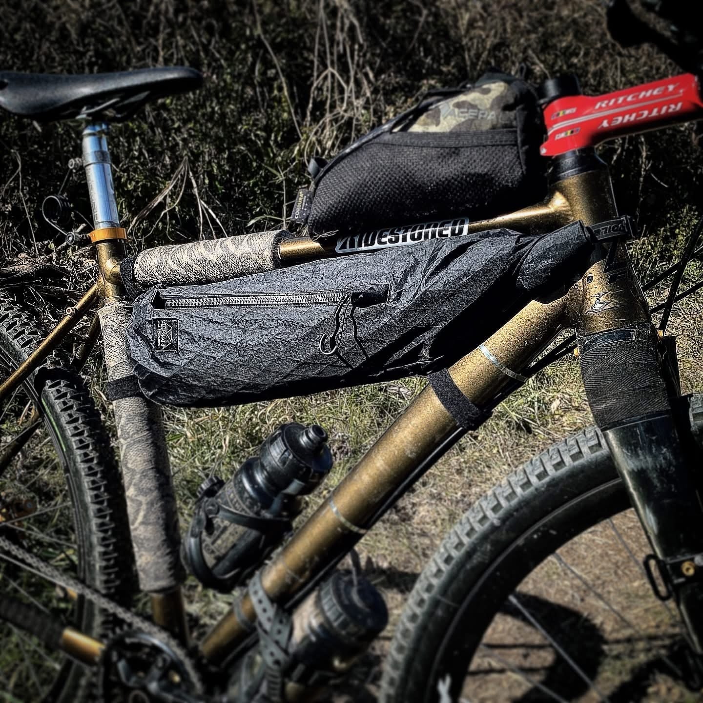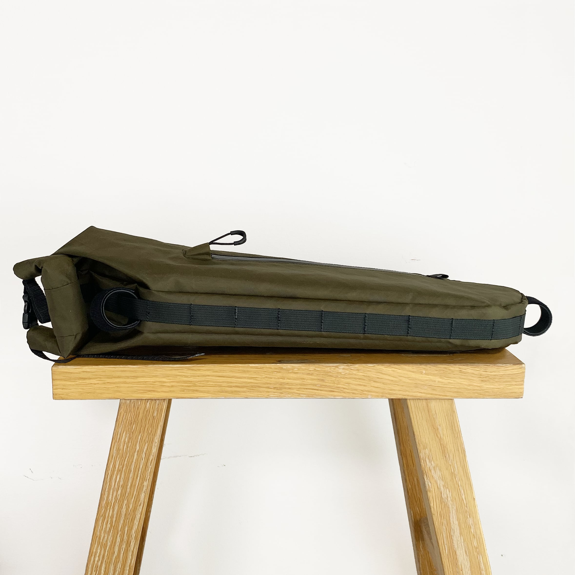 フレームバッグとしては先端がロール式なので長さを可変すればどんなサイズにも合わせられ、ノーマルなトップチューブから担ぎを想定したダウンチューブと場所もフレーム形状も選びません。