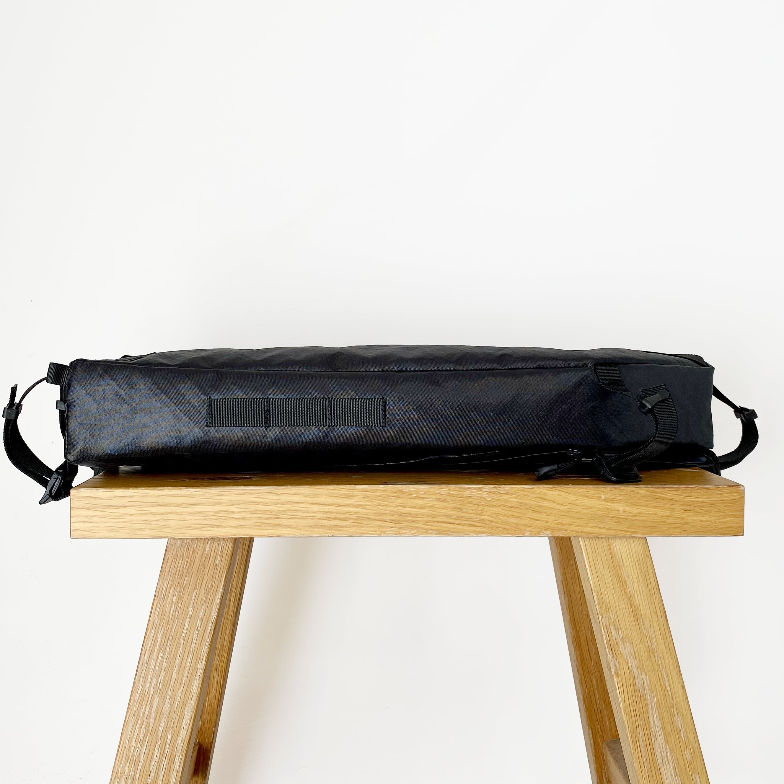 取り出し口がL字に大きく開くため焚き火五徳や細長いポールの出し入れが容易で、内部には荷物を固定する複数のエラスティック・ストラップを配しています。