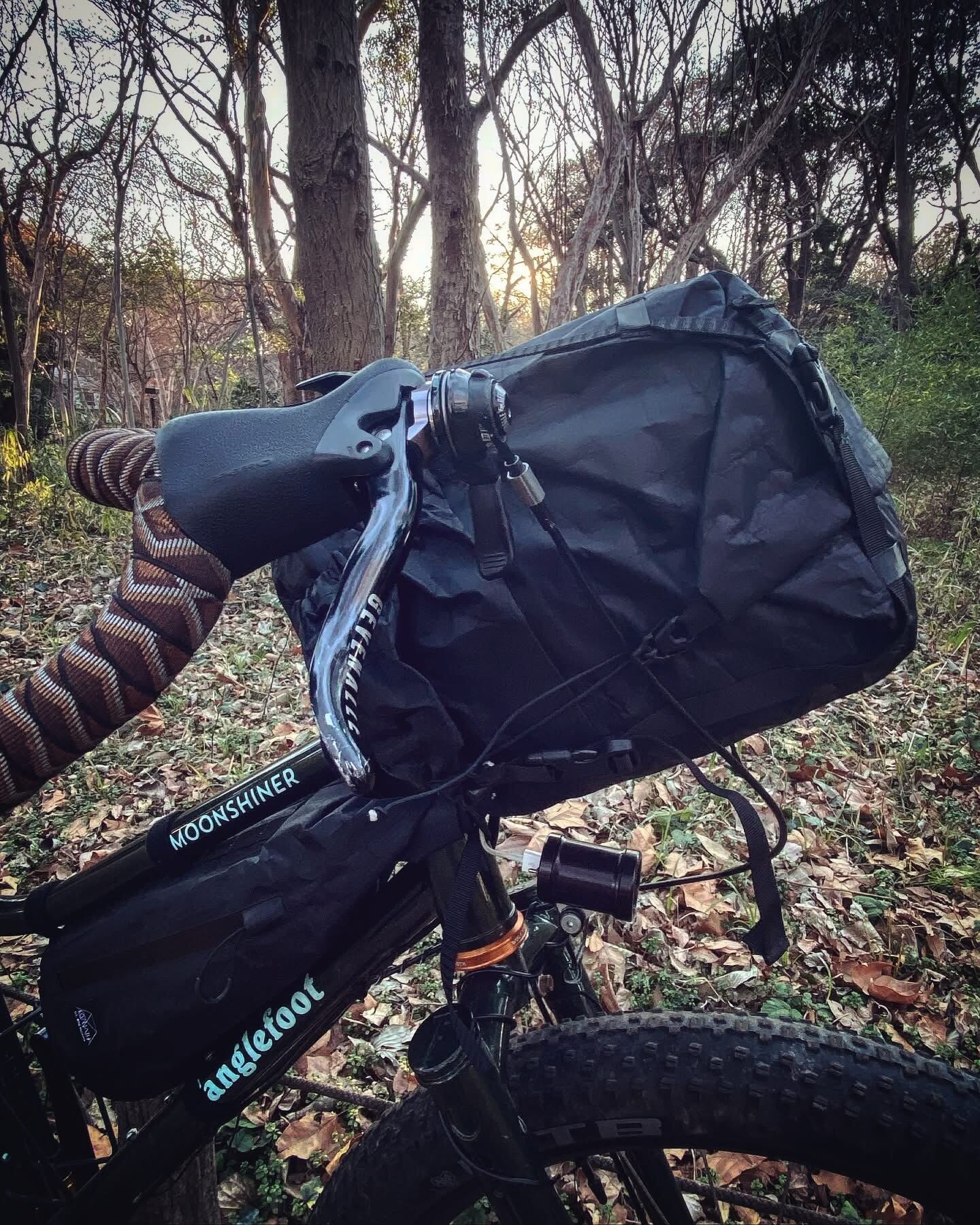 本体と両サイドのポケット合わせて約20リットル収納可能ながら重量僅か115gの大容量バッグ。ハンドルバーとヘッドチューブに固定すれば抜群の安定感を得られ、ラックやサポーター無しで装着したまま林道アタックも可能です。フロントロール式で前方向に伸びる構造のため、ハンドルに付けたライトやサイコン等に干渉しません。バッグサポーターを使用してサドルバッグとしても利用可能。